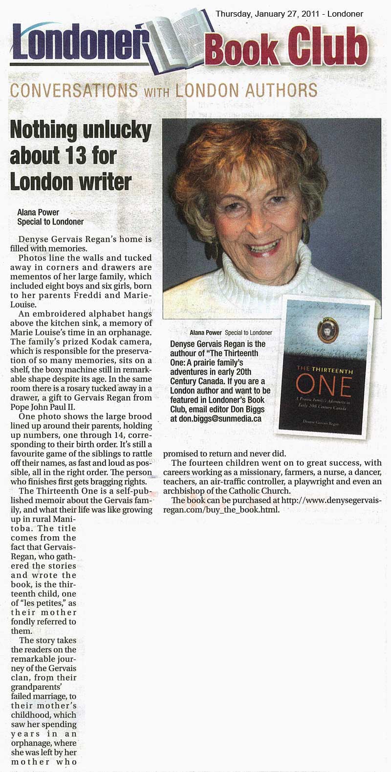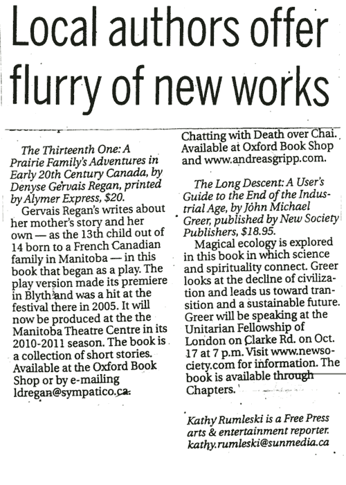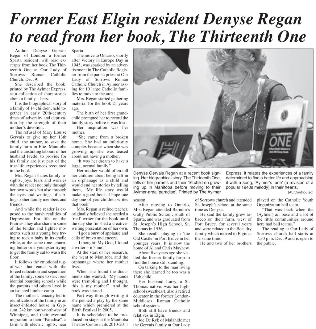 Denyse Gervais Regan’s lovingly recalled memories have already formed a play staged at the Blyth Festival. Scenes are included here. But there is drama everywhere in The Thirteenth One’s episodic flow. Many chapters are read-aloud material.